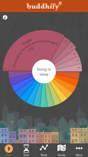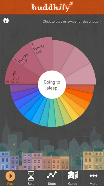 It is full of loads of short (5-15min) meditations for loads of different situations and is really clear and easy to use. You simply pick the category you want – from the colourful wheel, then pick a meditation you like the look of- by swiping up on the name you get a little description of what it is about and how long the meditation lasts for.