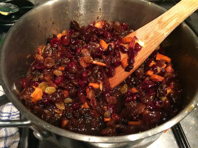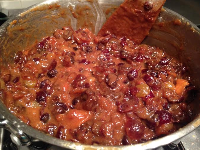 Then pour your soaked fruit into the pan with the molten mixture and stir thoroughly so that all the fruit is coated in the buttery sugary goodness.