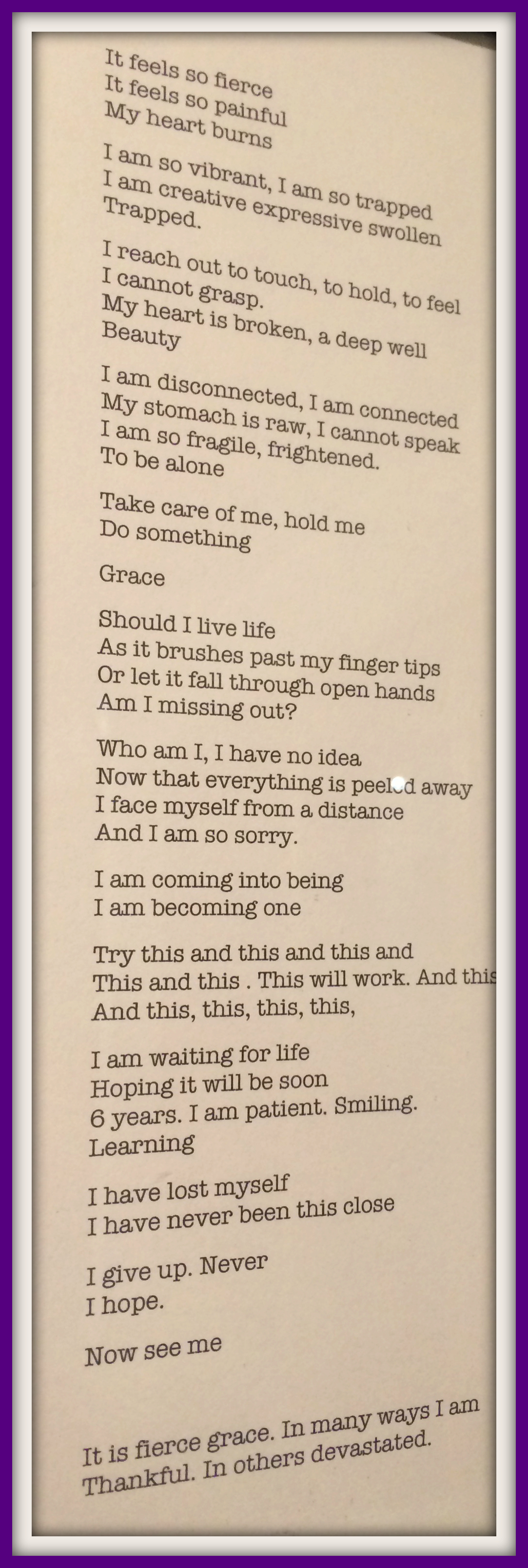 It comprised of a mixture of visual and written pieces. Each piece gave a moving insight into how this horrible illness effected each of their lives.